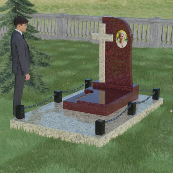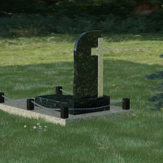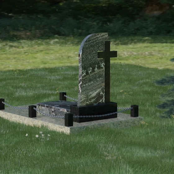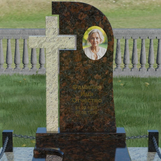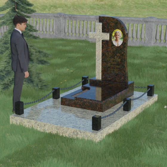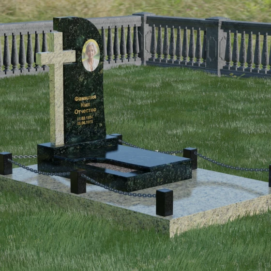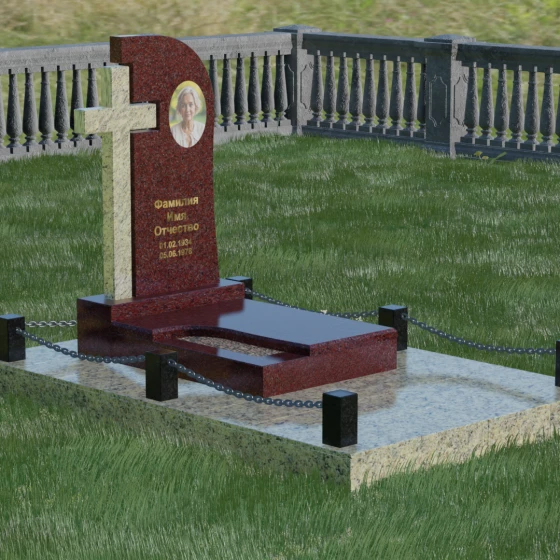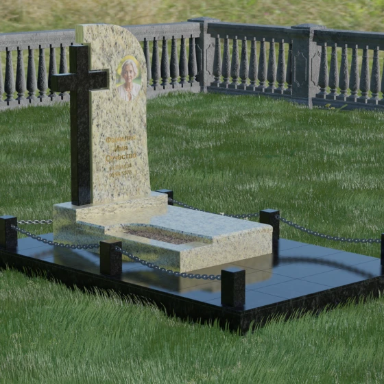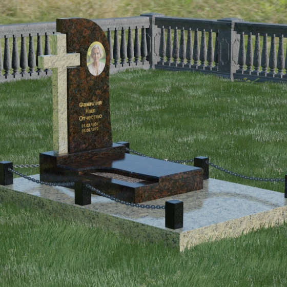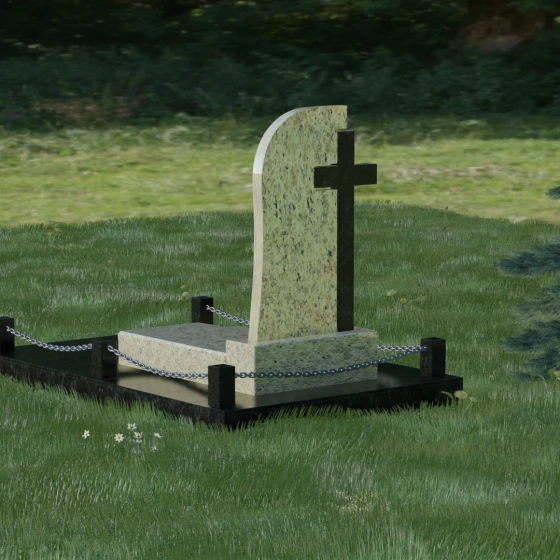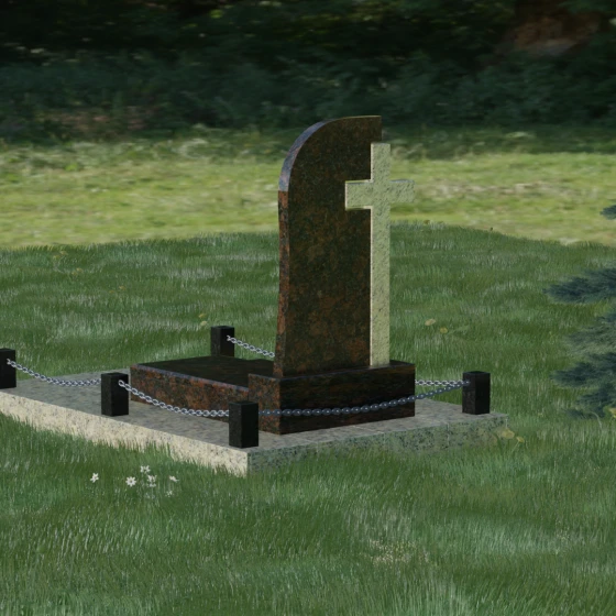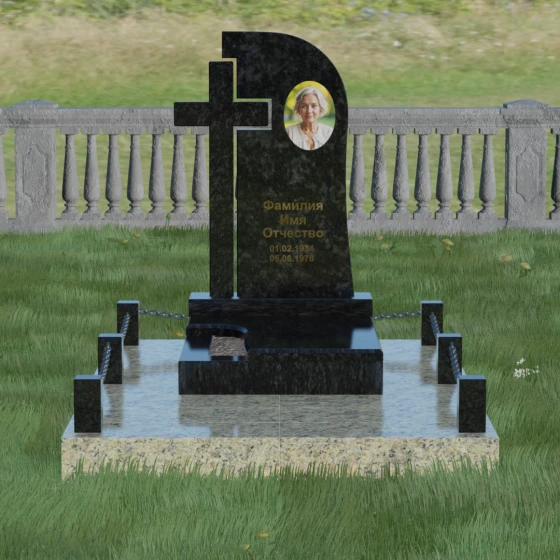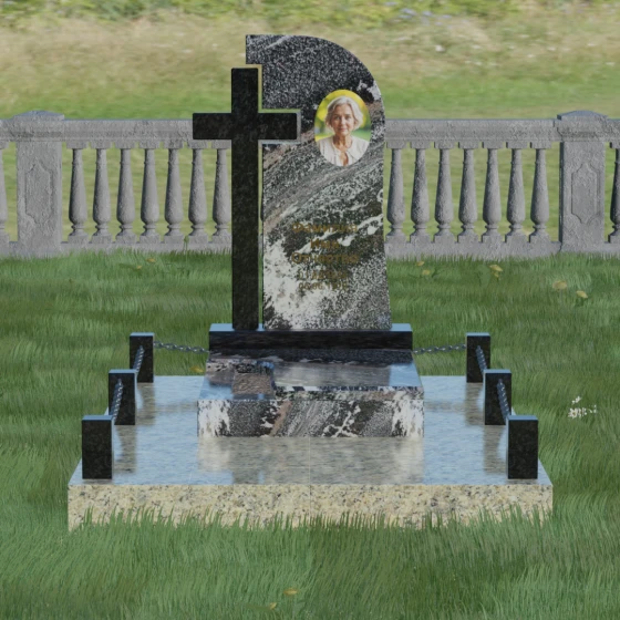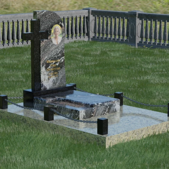 Каждый элемент этого надгробия несет в себе скрытый смысл. Высокий крест, интегрированный в саму структуру камня, выступает символом духовного покровительства и незыблемой веры. Асимметричная форма стелы олицетворяет жизненный путь, который никогда не бывает абсолютно ровным, но всегда стремится вверх, к свету. Массивное основание и каменное ограждение с цепями символизируют крепость семейных уз и нерушимую границу между суетным миром и вечным покоем. Эта форма вызывает чувство защищенности и монументальности, подчеркивая, что память о дорогом человеке так же тверда и вечна, как сам гранит.