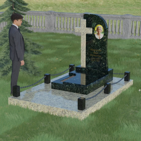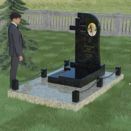Правая часть стелы — это широкое каменное полотно с мягким, плавным изгибом в верхней части, напоминающим небесный свод или церковный купол. Контраст между прямолинейностью креста и текучестью основной плиты создает уникальный художественный ритм. Боковые грани и верхушка изделия отполированы до зеркального блеска, в котором отражается небо, в то время как глубокая гравировка текста и портрета в овальной нише подчеркивают индивидуальность монумента. Особую массивность конструкции придает основание — монумент возведен на высокий гранитный цоколь. По периметру установлены монументальные столбики с декоративными фасками, соединенные массивными цепями, что создает защищенный контур и атмосферу уединенного покоя.