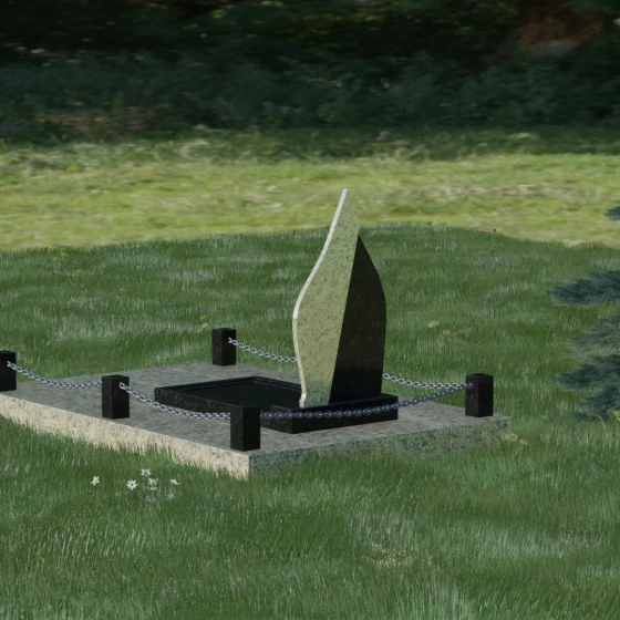 Центральным элементом ансамбля является вертикальная стела, чья форма напоминает застывшее пламя свечи или небесную слезу. Дизайн построен на изысканном контрасте двух видов камня, что придает монументу объем и динамику. Основная часть выполнена из глубокого темного гранита с идеальной зеркальной полировкой, в которой отражается небо, создавая ощущение чистоты и бесконечности. Правая грань стелы дополнена изящным «крылом» из более светлого, фактурного камня. Этот плавный изгиб символизирует жизненный путь, который никогда не бывает прямолинейным, и одновременно дарует чувство легкости и покоя.