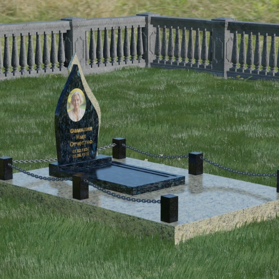 Особое внимание уделено благоустройству прилегающей территории. Мемориальная композиция включает в себя полное мощение участка массивными плитами из натурального камня. Это не только придает захоронению законченный и величественный вид, но и является практичным решением, избавляющим от необходимости постоянной борьбы с сорняками или проседания грунта. Периметр участка обозначен аккуратными каменными столбиками, соединенными декоративными цепями. Такая ограда создает визуальную и сакральную границу, защищая покой усопшего и подчеркивая обособленность места памяти. Каждый элемент — от полированных фасок на цоколе до золотистой гравировки имен — выполнен с ювелирной точностью.
