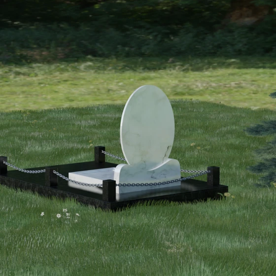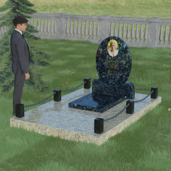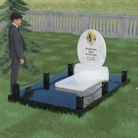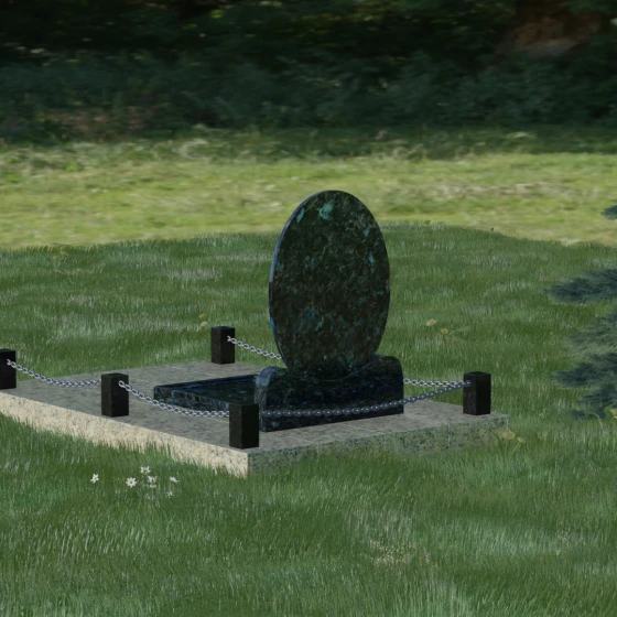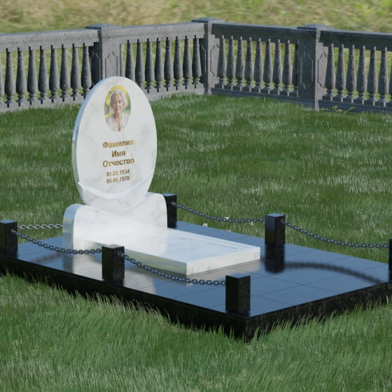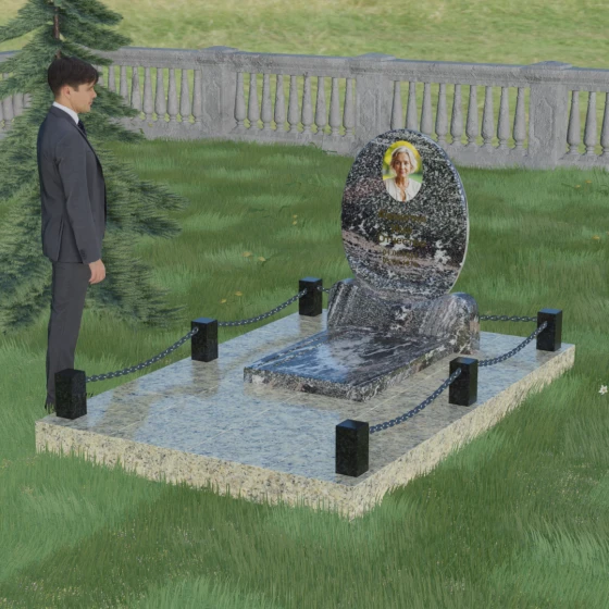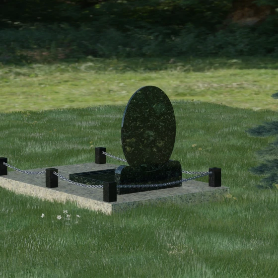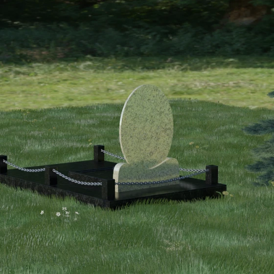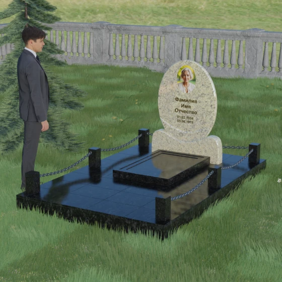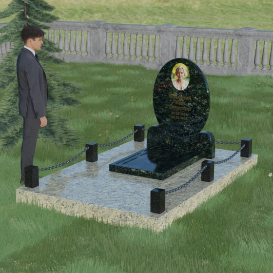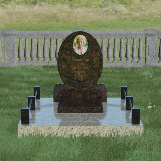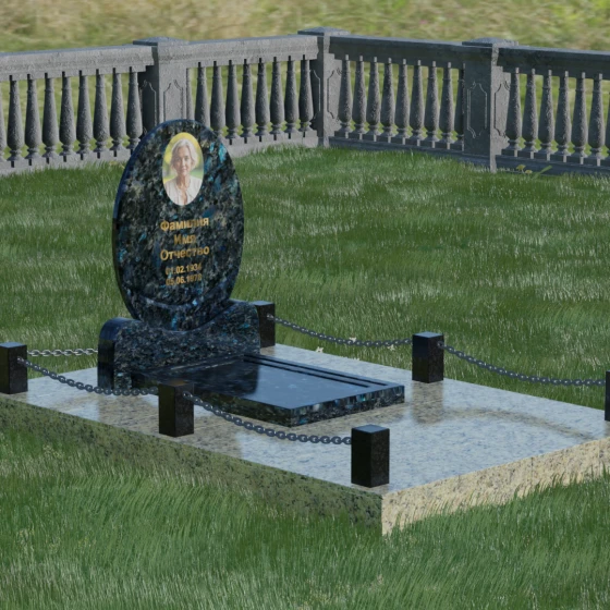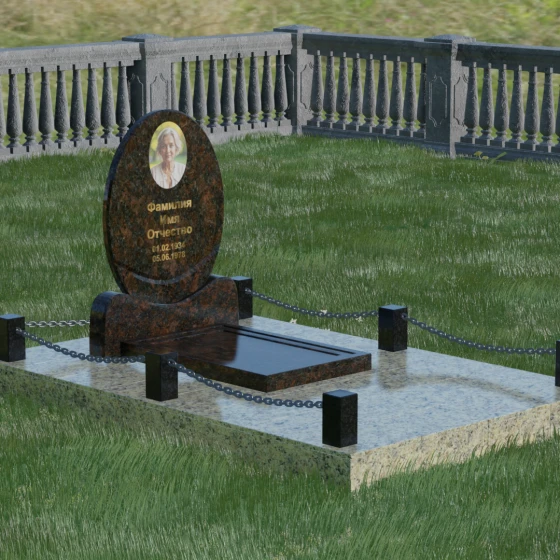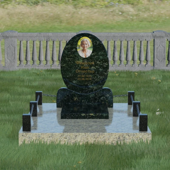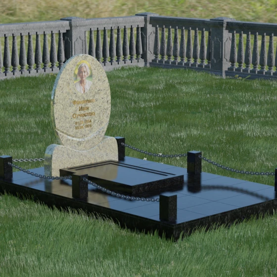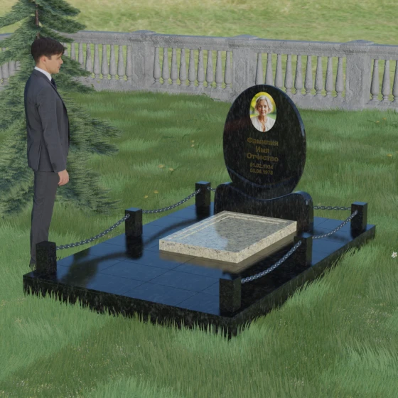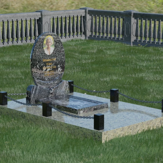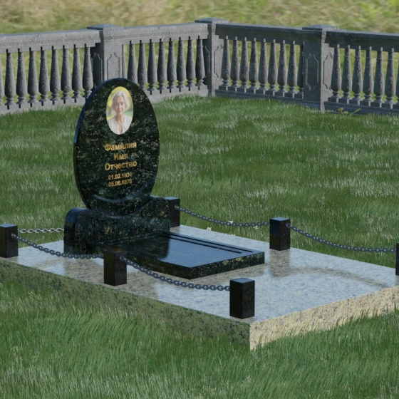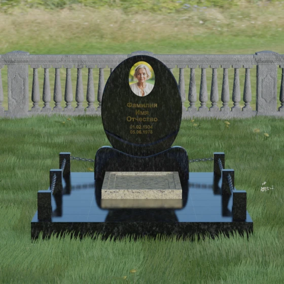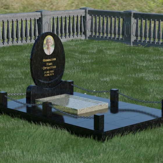 Центральным элементом стелы является глубокая ниша под овальный портрет (керамику или фото в стекле), которая идеально вписана в общую геометрию. Такое конструктивное решение защищает края портрета от сколов и придает образу завершенность. Ниже располагается пространство для эпитафии и дат, где каждая буква вырезается с идеальной четкостью. Благоустройство участка выполнено по высшему разряду: композиция дополняется массивной надгробной плитой, которая полностью закрывает цветник. Это не только придает объекту монументальный и законченный вид, но и значительно упрощает уход за местом памяти, избавляя от необходимости борьбы с сорняками. Периметр участка обрамляет строгий каменный цоколь, состоящий из полированных столбиков и соединительных элементов, которые могут быть дополнены декоративными цепями, создавая камерное и защищенное пространство.