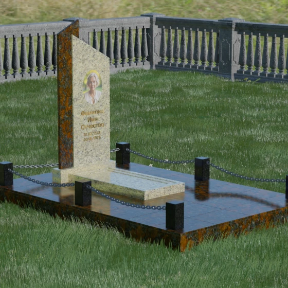 Особое внимание уделено благоустройству прилегающей территории. Мемориал установлен на прочное основание, а всё пространство участка закрыто сплошной надгробной плитой из натурального камня. Такое решение не только придает комплексу монолитный и законченный вид, но и значительно упрощает уход за местом захоронения, исключая прорастание сорной травы. Периметр участка обозначен изысканным ограждением: массивные гранитные столбики соединены декоративными цепями, что создает атмосферу защищенности и уединения, отделяя мемориальное пространство от внешнего мира.