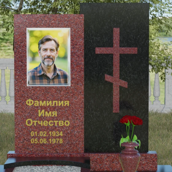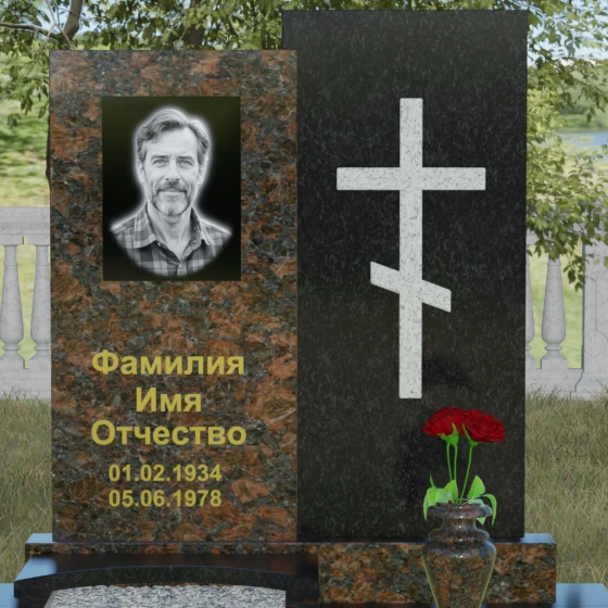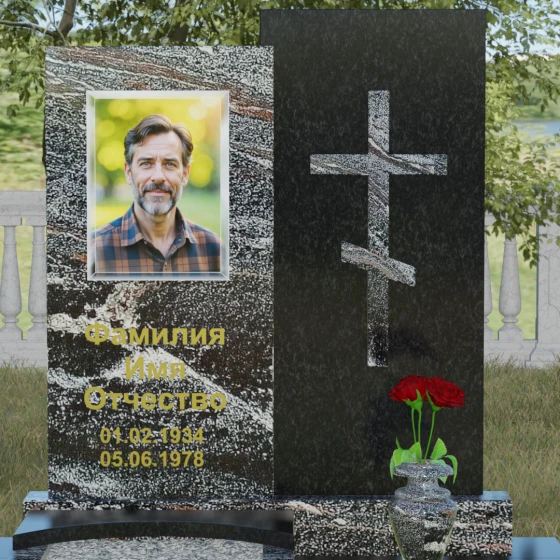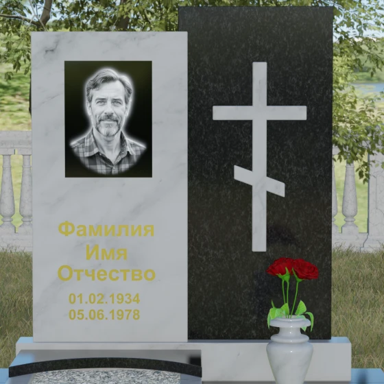 Данная модель представляет собой сложную двухкомпонентную конструкцию, построенную на гармонии противоположностей. Основной вертикальный элемент разделен на две части разного цвета и фактуры. Левая панель, выполненная из темного, глубокого камня, предназначена для центрального акцента — портрета и мемориальных надписей. Благодаря идеальной гладкости, гравировка здесь выглядит максимально четко, а портрет обретает фотографическую точность и одухотворенность. Правая часть композиции — это блок из светлого камня, на котором располагается лаконичный православный крест. Крест выполнен в строгом черном цвете, что создает мощный визуальный контраст на светлом фоне, подчеркивая духовную чистоту и значимость символа веры. Геометрия модели подчеркнуто строгая: прямые линии и четкие грани символизируют твердость характера и прямоту жизненного пути.