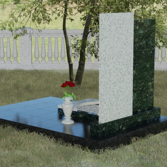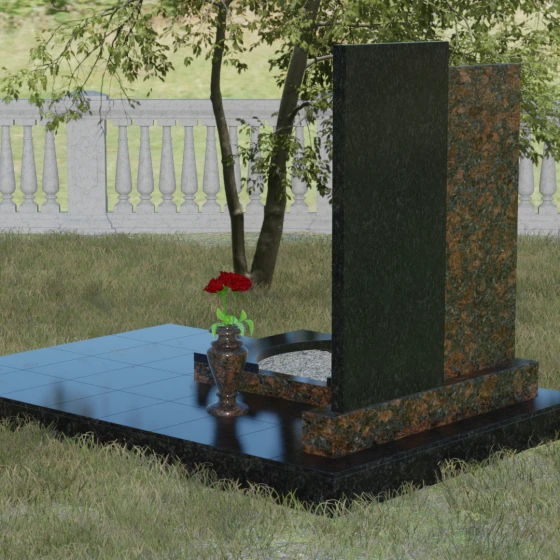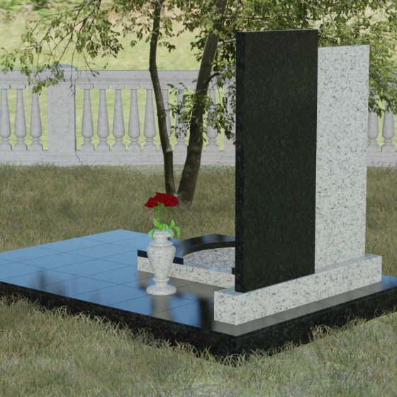 Благоустройство участка в данной модели выполнено по европейскому стандарту. Весь ансамбль установлен на массивный гранитный цоколь, который служит надежным фундаментом и защищает конструкцию от перекосов почвы. Вместо традиционного открытого цветника здесь используется закрытая надгробная плита оригинальной формы. Её верхний элемент выполнен в виде изящной светлой арки, которая эффектно возвышается над темным основанием, создавая многоуровневость. Такое решение не только придает мемориалу законченный, аккуратный вид, но и значительно упрощает уход за местом захоронения. Завершает композицию изящная каменная ваза, интегрированная в общую стилистику, что позволяет всегда поддерживать эстетику участка, украшая его цветами в знак вечной любви.