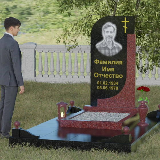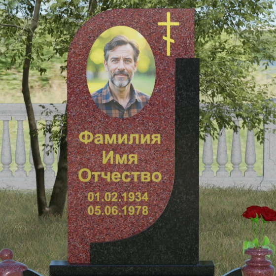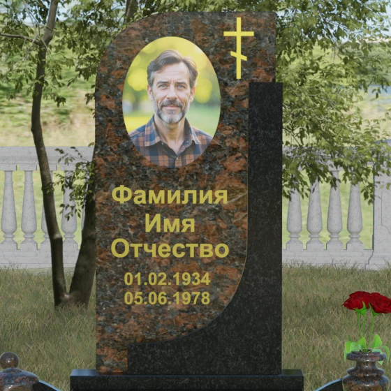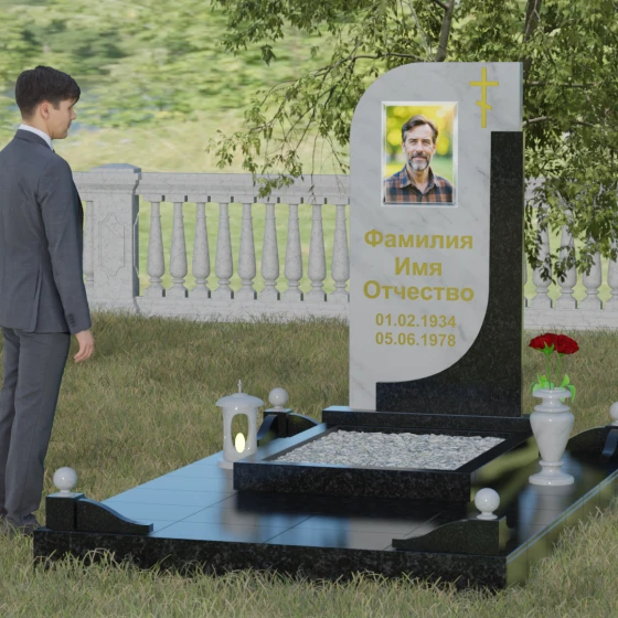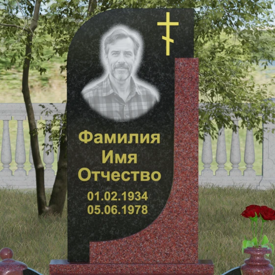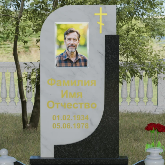 Данная модель отличается уникальной комбинированной архитектурой, которая мгновенно приковывает взгляд за счет игры форм и цветов. Основная вертикальная стела имеет асимметричный силуэт: ее левая сторона плавно закругляется, образуя изящную волну, в то время как правая грань остается подчеркнуто строгой и прямой. Это сочетание мягкости и твердости символизирует дуальность жизни. С правой стороны стелу дополняет контрастная вертикальная вставка из камня другого оттенка, которая придает всей конструкции объем и архитектурную завершенность. В верхней части основной плиты лаконично расположен православный восьмиконечный крест, выполненный методом глубокой гравировки с последующим золочением. Его строгие линии подчеркивают духовную значимость монумента, не перегружая общую композицию лишними деталями.