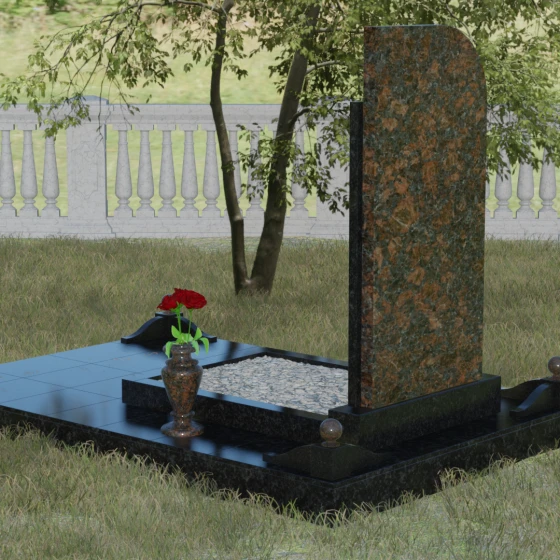 Особое внимание уделено благоустройству основания. Памятник установлен на массивный гранитный цоколь, который служит надежным фундаментом и защищает конструкцию от перекосов со временем. Композиция дополнена изящной каменной вазой и декоративными элементами в виде шаров на подставках, выполненными в единой цветовой гамме с дополнительной колонной стелы. Такое комплексное решение создает законченный ансамбль, избавляя вас от необходимости дополнительно подбирать аксессуары. Гладкие, тщательно обработанные грани каждого элемента подчеркивают высокий статус изделия и его исключительную долговечность.