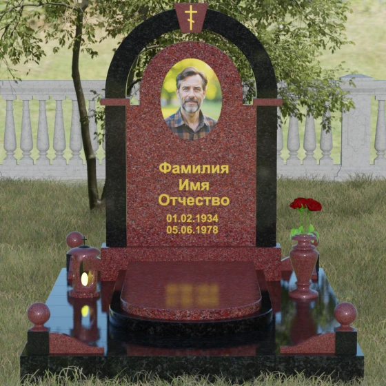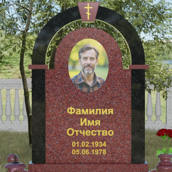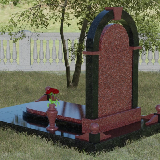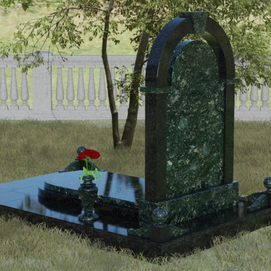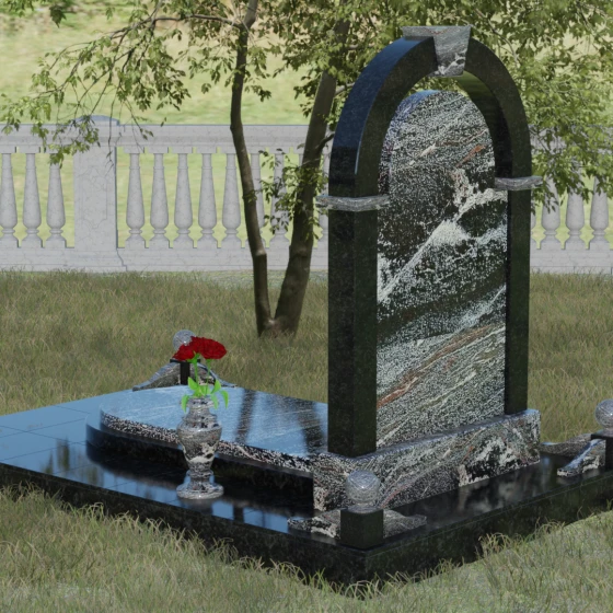 Представленная мемориальная композиция — это триумф архитектурной мысли, воплощенный в благородном камне. В основе дизайна лежит классическая форма арки, которая во многих культурах символизирует небесный свод и торжественный переход в вечность. Центральная стела, имеющая мягкое скругление сверху, обрамлена массивным внешним контуром, создающим эффект глубины и защищенности. Такое многоуровневое решение позволяет играть на визуальных объемах: строгие вертикальные линии боковых колонн уравновешиваются плавным изгибом верхней части, подчеркивая гармонию и покой. Зеркальная полировка лицевых граней доведена до совершенства, в ней отражается мир, напоминая о хрупкой связи между прошлым и настоящим.
