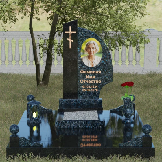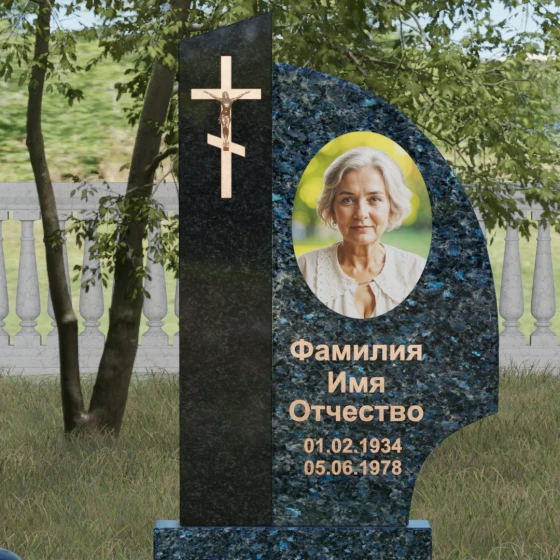 Оформление и советы искусствоведа: Для данной модели идеально подходит гравировка портрета в овальном или круглом формате, размещенная в верхней части «волнообразной» стелы. Это уравновешивает массивность левой части с крестом. Текст (ФИО и даты) рекомендуется выполнять глубоким академическим шрифтом с последующим покрытием сусальным золотом или «под бронзу», чтобы поддержать цветовую гамму распятия. Зеркальная полировка камня обеспечит четкость гравировки, которая не потускнеет и через сто лет, требуя лишь минимального ухода — протирки мягкой ветошью.