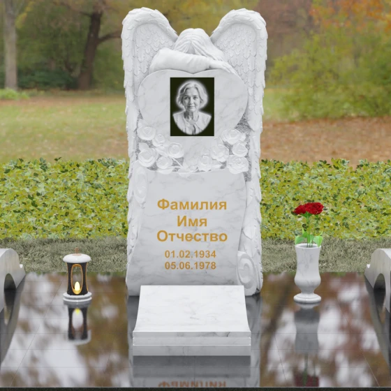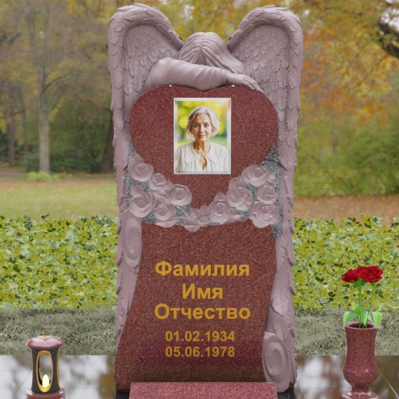 Особое внимание уделено флористическим мотивам. В основании «сердца» вырезаны объемные бутоны роз. Их лепестки, выполненные в технике глубокого барельефа, кажутся живыми и нежными, несмотря на твердость материала. Эти цветы не просто украшают изваяние, они олицетворяют вечную любовь, которая не увядает со временем. Плавные, текучие линии стелы гармонично сочетаются с архитектурной строгостью основания, создавая завершенный и эстетически безупречный ансамбль.
