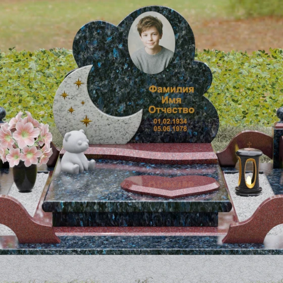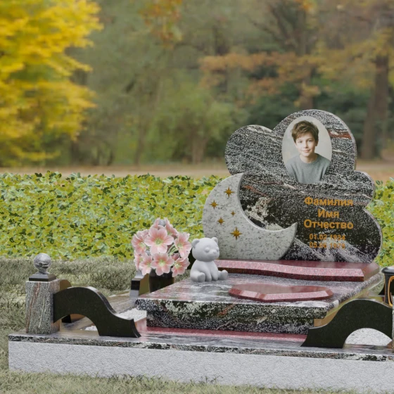 Данная мемориальная композиция — это воплощение нежности, глубокой любви и тихой грусти, застывшей в благородном камне. Выбор такой формы продиктован желанием выразить самые светлые чувства к ушедшему близкому человеку. Силуэт стелы, выполненный в виде мягкого, кучевого облака с плавными, округлыми очертаниями, символизирует покой и вечную жизнь души в небесных сферах. Асимметричная геометрия придает монументу индивидуальность, выделяя его среди строгих прямоугольных форм, и создает ощущение легкости, несмотря на внушительный вес натурального гранита. Особый акцент сделан на игре фактур и цветов: основная часть монумента из темного камня гармонично сочетается со вставкой из светлого гранита в форме изящного полумесяца. На этом светлом фоне выгравированы лаконичные золотые звезды, которые словно освещают путь памяти через десятилетия.