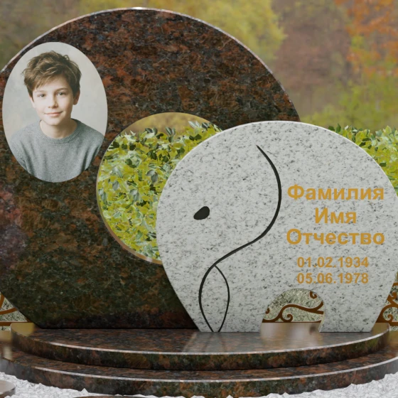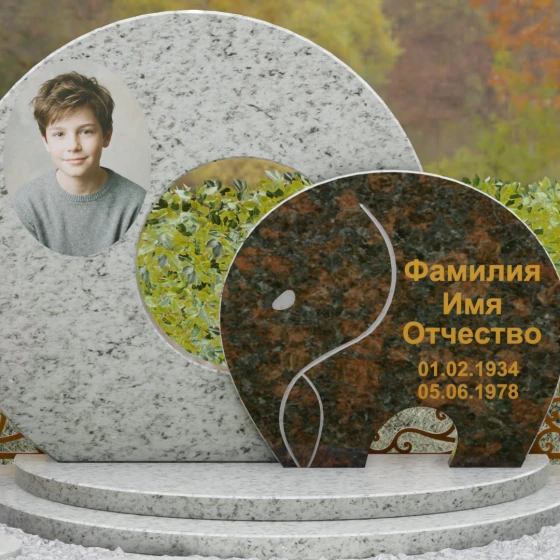 Оформление и художественные советы: Для данной формы идеально подходит классическое размещение портрета на левой стороне основного диска — это может быть как фотокерамика, так и гравировка. ФИО и даты жизни рекомендуются к нанесению на передний контрастный элемент. Использование сусального золота или бронзовой краски в оформлении букв идеально подчеркнет теплоту натурального камня, особенно если вы выберете сочетание темного Габбро и цветного гранита. Плавные линии стелы диктуют выбор мягких, округлых шрифтов, которые подчеркнут общую эстетику композиции.