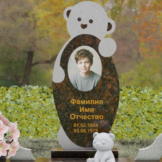 Данная мемориальная композиция представляет собой уникальный образец художественной резьбы по камню, где детская непосредственность встречается с монументальной торжественностью. В центре внимания — трогательный образ медвежонка, который словно оберегает покой ушедшего, заключая его портрет в свои ласковые объятия. Форма стелы лишена острых, агрессивных углов; здесь превалируют плавные, округлые линии, символизирующие бесконечность любви и мягкость воспоминаний. Мастерски выполненный контраст между глубокой зеркальной полировкой темного камня и светлой, матовой фактурой «головы» и «лап» изваяния создает эффект объема и многослойности.