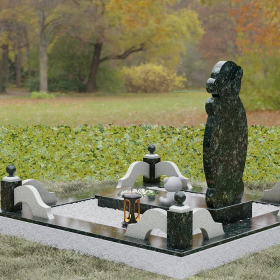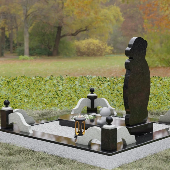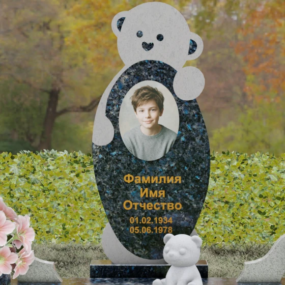 Особое внимание уделено деталям резьбы: носик медвежонка выполнен в форме небольшого сердца, что придает всей конструкции особую эмоциональную глубину. Центральная часть стелы предназначена для размещения классического овального портрета, который гармонично вписывается в общую геометрию. Грани камня обработаны с ювелирной точностью — фаски мягко преломляют свет, подчеркивая безупречную чистоту природного материала и высокое мастерство камнерезов.