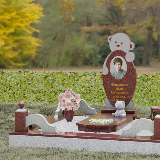 • Скульптурное дополнение: У подножия основной стелы расположена миниатюрная фигурка медвежонка, вырезанная из светлого камня, которая дублирует главный мотив и делает мемориал еще более трогательным.