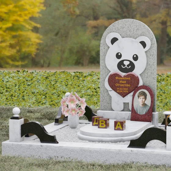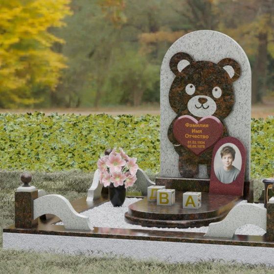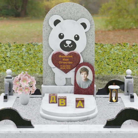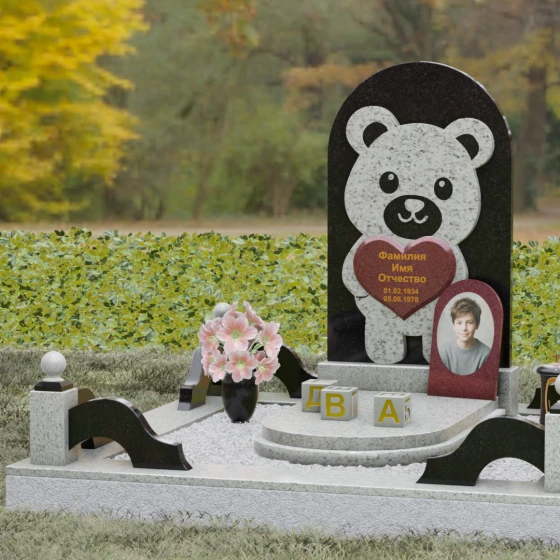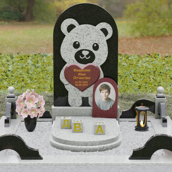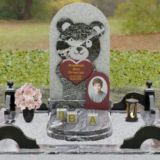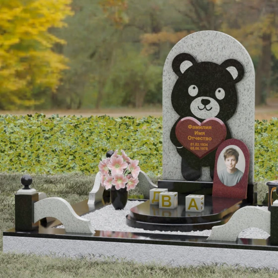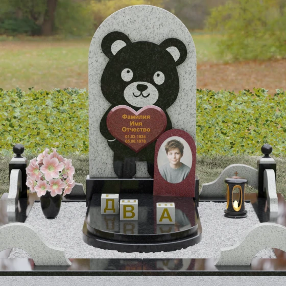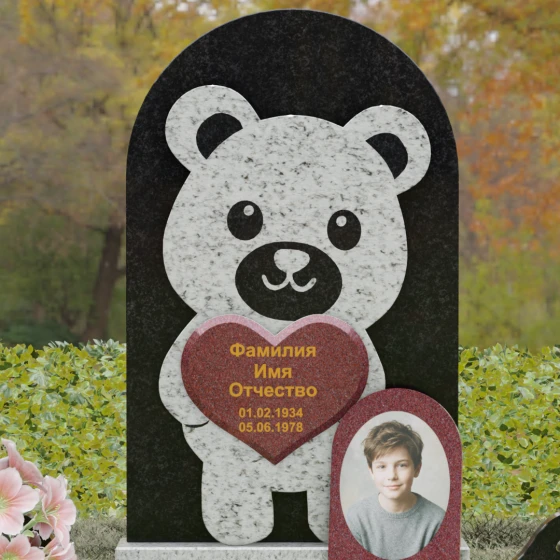 Данная мемориальная композиция представляет собой уникальное сочетание трогательной нежности и величественной непоколебимости камня. В центре художественного замысла лежит глубокий символизм: фигура медвежонка, бережно держащего в лапах сердце, олицетворяет чистоту, бесконечную родительскую любовь и защиту, которую близкие стремятся подарить даже после ухода дорогого человека. Это надгробие из натурального камня выполнено в технике художественного комбинирования различных пород, что создает потрясающий визуальный объем. Массивная светлая стела с полукруглым завершением служит идеальным фоном для темного силуэта, вырезанного с ювелирной точностью. Игра контрастов между зеркальной полировкой черного камня и благородной текстурой светлого гранита подчеркивает каждую деталь: от доброго взгляда лесного покровителя до мягких контуров его фигуры.