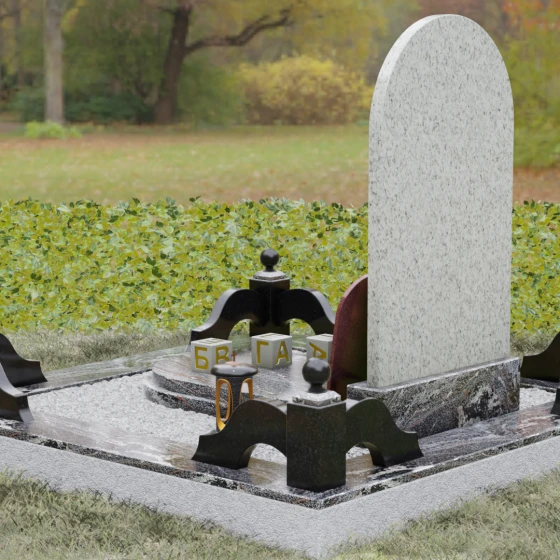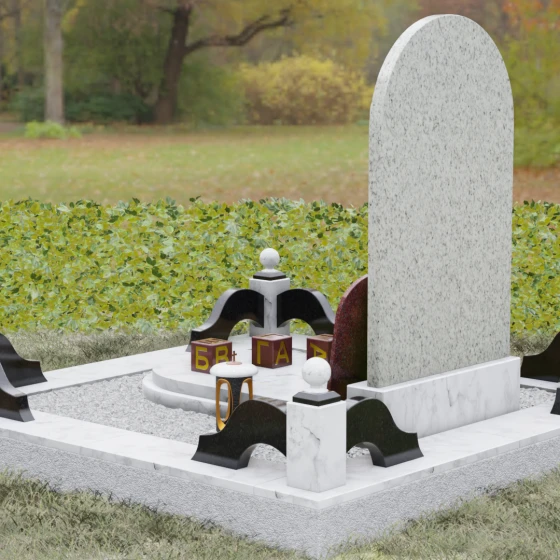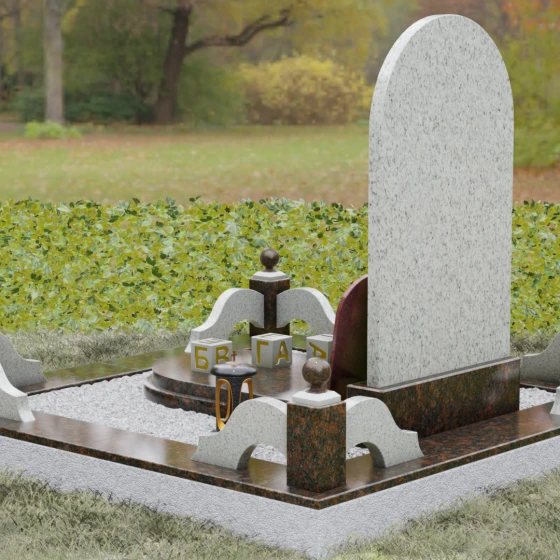 Художественное решение памятника продумано до мелочей, включая элементы благоустройства, которые создают единый архитектурный ансамбль. Стела установлена на массивный постамент, который обеспечивает устойчивость всей конструкции. Композицию дополняет изящный цоколь с декоративными столбиками, увенчанными каменными шарами. Эти элементы не только очерчивают границы участка, но и придают ему торжественный, законченный вид. В нижней части композиции предусмотрена отдельная вставка — овальный медальон из красного камня, идеально подходящий для размещения фотокерамики или гравированного портрета. Такое расположение позволяет гармонично разделить текстовую информацию и визуальный образ, не перегружая основную художественную часть.