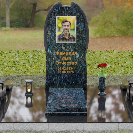 На широкой лицевой панели предусмотрено идеальное место для расположения портрета. Форма стелы позволяет гармонично вписать как классическую гравировку, так и цветной керамический медальон в овальной нише. Золоченая вырубка букв, как показано в образце, идеально сочетается с фактурной резьбой крыльев, делая надписи читаемыми и эстетически безупречными. Мы поможем вам подобрать именно то сочетание камня и декора, которое станет достойным отражением души того, кто вам дорог.
