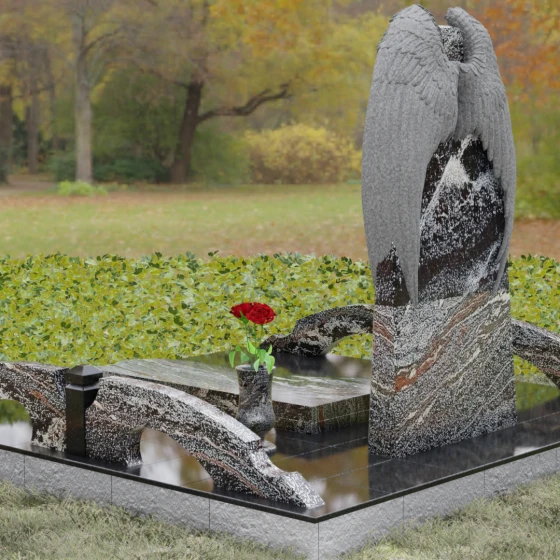 Данное ритуальное изделие (артикул 161) представляет собой подлинное воплощение тихой скорби и небесного покровительства. В центре художественной композиции находится вертикальная стела, которую бережно, словно в последнем земном объятии, обрамляют два резных ангельских крыла. Плавность изгибов этих элементов символизирует чистоту души и бесконечный жизненный путь, переходящий в вечный покой. Мастера уделили особое внимание детализации: каждое перышко на крыльях проработано с ювелирной точностью, создавая глубокий рельеф и объем, который эффектно контрастирует с идеально гладкой, зеркальной поверхностью основной части камня.