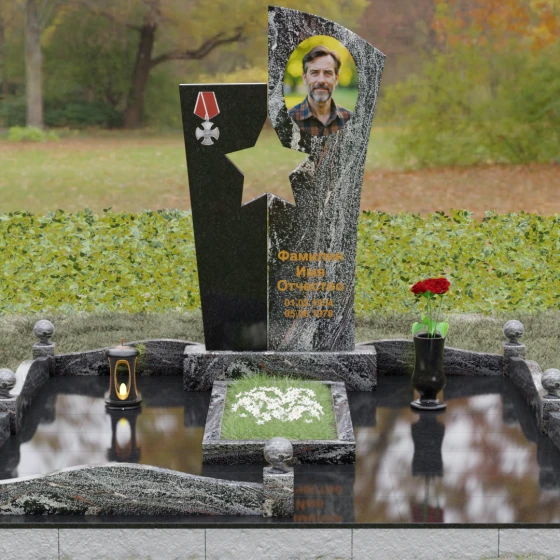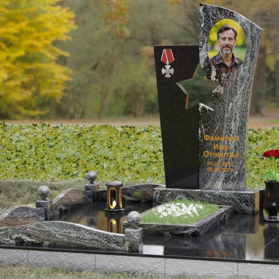 Геометрия ансамбля поражает своей монументальной строгостью и одновременно изяществом. Правое вертикальное полотно, предназначенное для портрета и эпитафии, имеет скошенную верхнюю грань, что придает всей конструкции динамику, устремленность ввысь. В данном проекте мастерски использована игра фактур: зеркально отполированная поверхность основного камня, в которой отражается мир, контрастирует с матовыми срезами внутри резной звезды. Такое сочетание придает мемориалу дополнительный объем и заставляет свет играть на гранях камня, подчеркивая величие и незыблемость памяти о герое.
