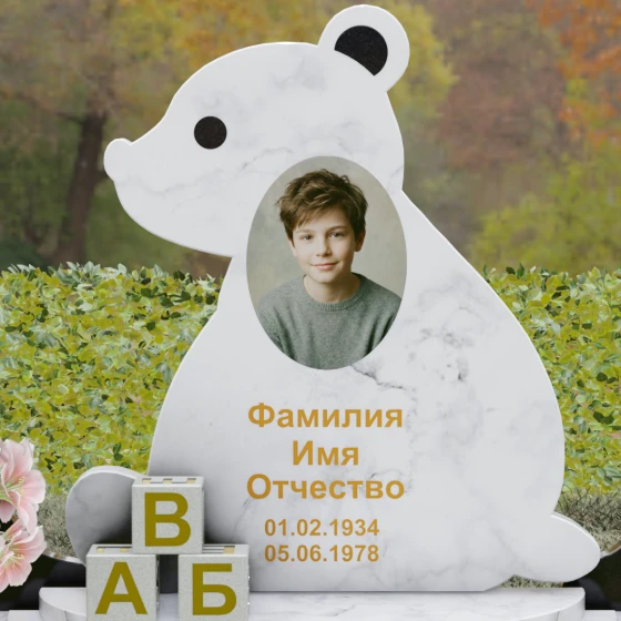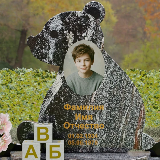 Центральным элементом ансамбля является стела, выполненная в уникальной форме силуэта плюшевого мишки. Это решение выбрано не случайно: мягкие, округлые контуры ушей и головы создают ощущение защищенности и бесконечной любви. Мастера-камнерезы добились идеальной плавности переходов, превратив массивную плиту в трогательную скульптуру. В центре силуэта расположена овальная вставка для портрета, которая визуально акцентирует внимание на образе ушедшего, делая его смысловым сердцем всей композиции. Нижняя часть стелы дополнена объемными декоративными элементами в виде детских кубиков с буквами «А», «Б» и «В». Эти малые архитектурные формы вырезаны из камня с высокой точностью, подчеркивая тематику вечного детства.