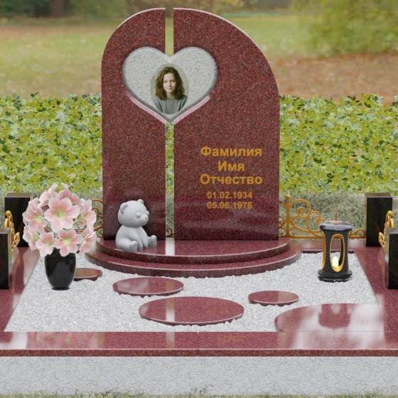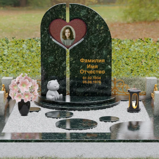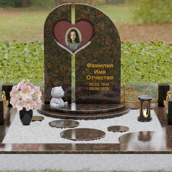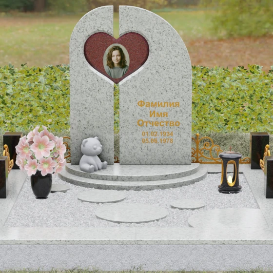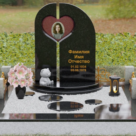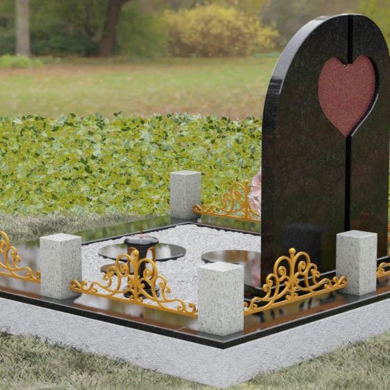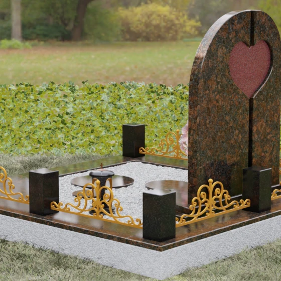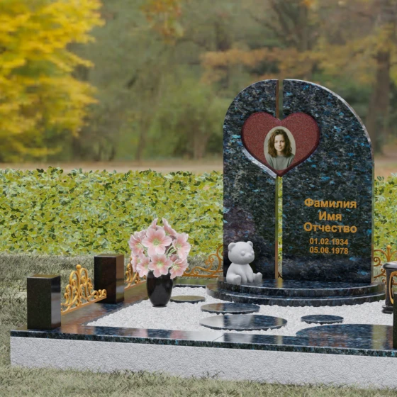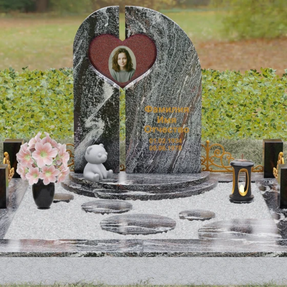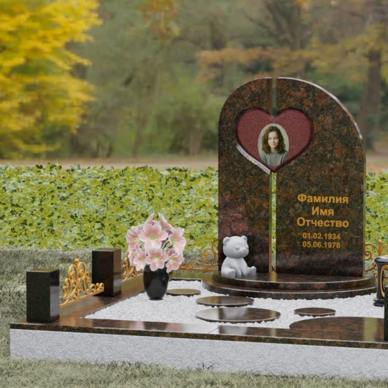 Данный гранитный монумент представляет собой сложную архитектурную композицию, где классические каноны мемориального искусства встречаются с современным европейским стилем. Выбор этой модели обусловлен её глубоким символизмом: центральный элемент выполнен в виде асимметричного полотна с изящным вырезом в форме сердца. Этот художественный прием превращает холодный камень в осязаемое воплощение любви и непреходящей скорби. Плавный изгиб верхней грани и вертикальное разделение основной плиты создают динамичный, но при этом умиротворенный силуэт, который гармонично доминирует над пространством захоронения.