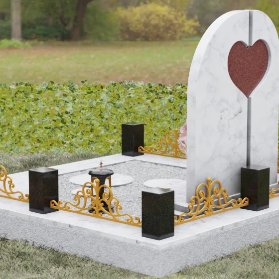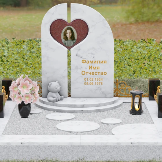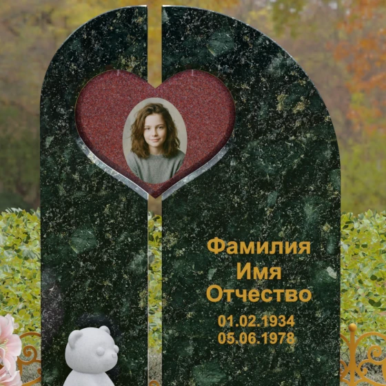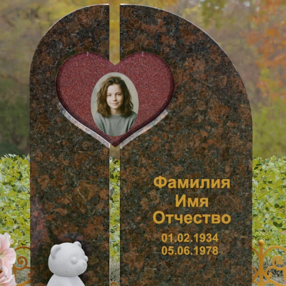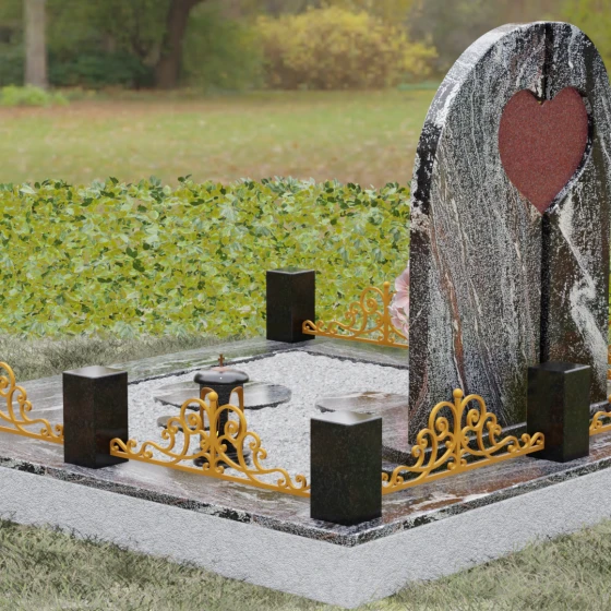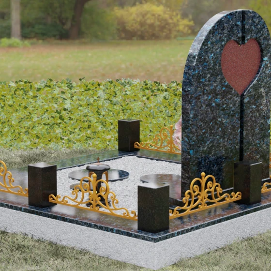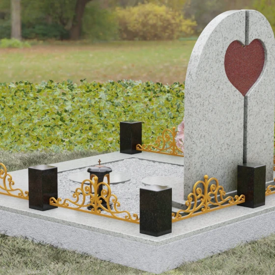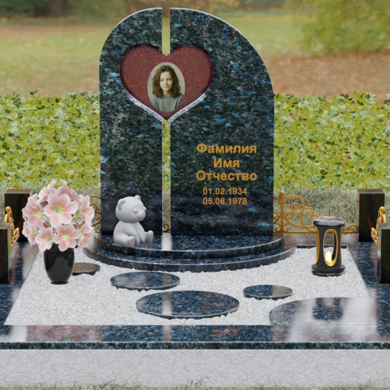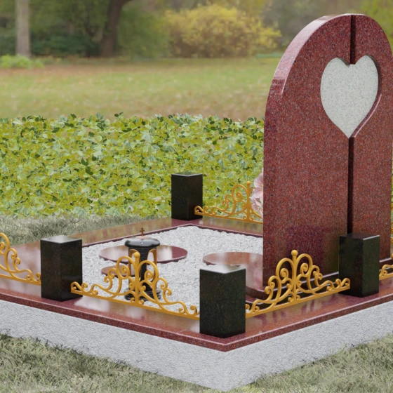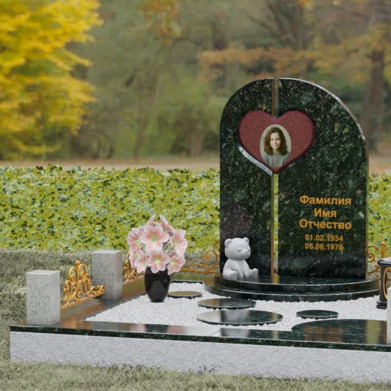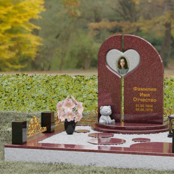Данный гранитный монумент представляет собой сложную архитектурную композицию, где классические каноны мемориального искусства встречаются с современным европейским стилем. Выбор этой модели обусловлен её глубоким символизмом: центральный элемент выполнен в виде асимметричного полотна с изящным вырезом в форме сердца. Этот художественный прием превращает холодный камень в осязаемое воплощение любви и непреходящей скорби. Плавный изгиб верхней грани и вертикальное разделение основной плиты создают динамичный, но при этом умиротворенный силуэт, который гармонично доминирует над пространством захоронения.