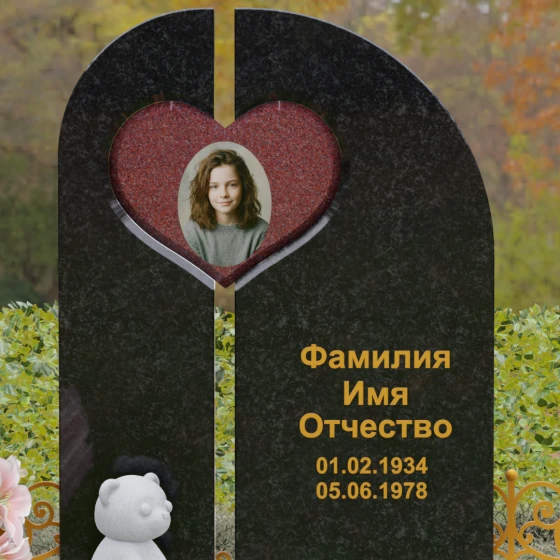 Особое внимание в данной модели уделено интеграции портрета. Ниша в форме сердца, расположенная в левой части композиции, является идеальным обрамлением для керамического фото или гравировки. Такое расположение акцентирует внимание на образе близкого человека, защищая его визуально «внутри» камня. Правая часть обелиска предназначена для лаконичного нанесения имени и дат, которые могут быть выполнены сусальным золотом или глубокой пескоструйной гравировкой, что идеально контрастирует с полированной поверхностью.