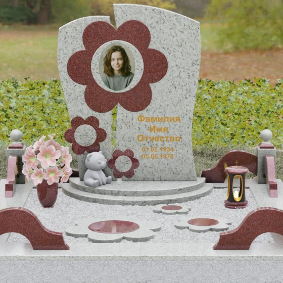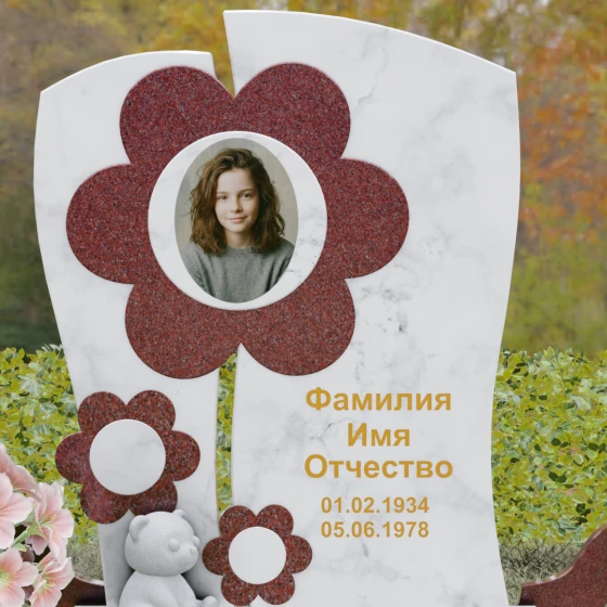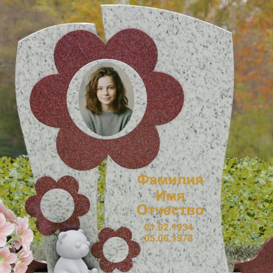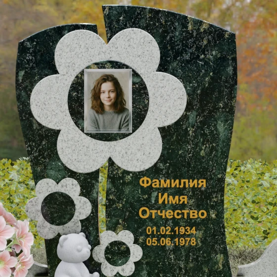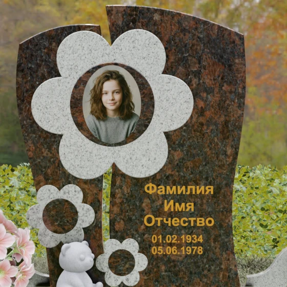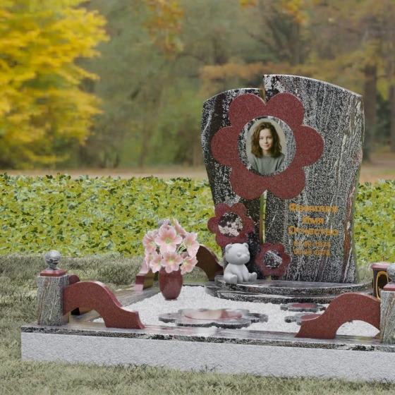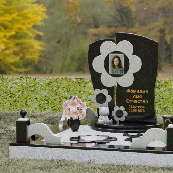 Представленный мемориальный ансамбль (Артикул 241) — это не просто памятник, а подлинное художественное произведение, в котором застыла нежность и вечная весна. В центре композиции находится величественная стела, выполненная в уникальной комбинированной технике. Ее асимметричная форма с деликатным вертикальным разделением создает динамичный и в то же время гармоничный силуэт. Главным акцентом является искусно вырезанный из камня цветок, в сердцевину которого помещен портрет. Плавные, округлые лепестки символизируют чистоту и хрупкость жизни, а их объемная фактура создает удивительную игру света и тени, контрастируя с глубокой зеркальной полировкой основного полотна стелы.