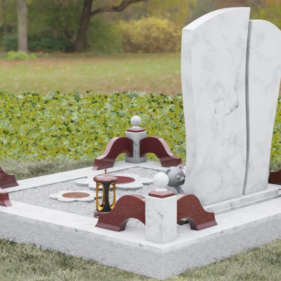 Мастерство камнереза здесь проявляется в каждой детали: от точно выверенных изгибов основной плиты до малых декоративных цветов у подножия, которые словно «прорастают» сквозь твердый гранит. Благоустройство участка выполнено в едином стилистическом ключе, создавая законченный и торжественный вид. Основание памятника опирается на сложный многоуровневый цоколь. Массивный каменный бордюр с плавными волнообразными линиями обрамляет место захоронения, обеспечивая эстетическую чистоту и легкость в уходе. Углы композиции акцентированы изящными столбиками с навершиями в виде полированных шаров, а установленная каменная лампада и скульптурная фигурка медвежонка добавляют мемориалу особую душевную теплоту и индивидуальность.
