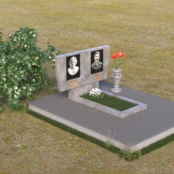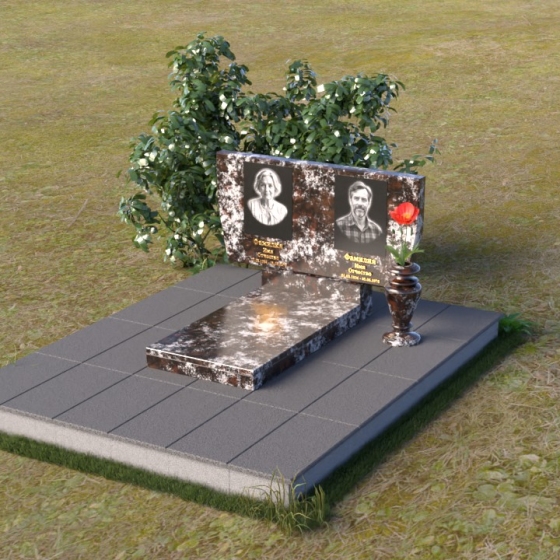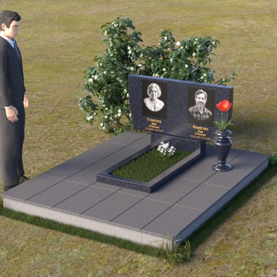 Это ритуальное изделие представляет собой гармоничное сочетание прямых линий и мягких, едва уловимых изгибов, создающих ощущение покоя и умиротворения. Стела имеет прямоугольную форму, но ее верхняя грань слегка скошена, что придает ей визуальную легкость и динамику. Обратите внимание на зеркальную полировку лицевой стороны – она отражает небо и окружающий мир, словно заключая в себе вечность. На полированной поверхности выгравированы портреты усопших и памятные надписи, выполненные с высокой точностью и детализацией. Слева от стелы, на основании, располагается небольшая горизонтальная плита с аналогичной полировкой, создающая дополнительное пространство для цветов или памятных предметов. Основание памятника выполнено из серого камня с матовой фактурой, что создает контраст с блестящей стелой и придает композиции устойчивость и завершенность. Рядом с плитой установлена ваза, выполненная из того же черного полированного гранита, что и стела, что обеспечивает единство стиля и служит достойным обрамлением для живых цветов, символизирующих вечную память.