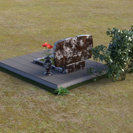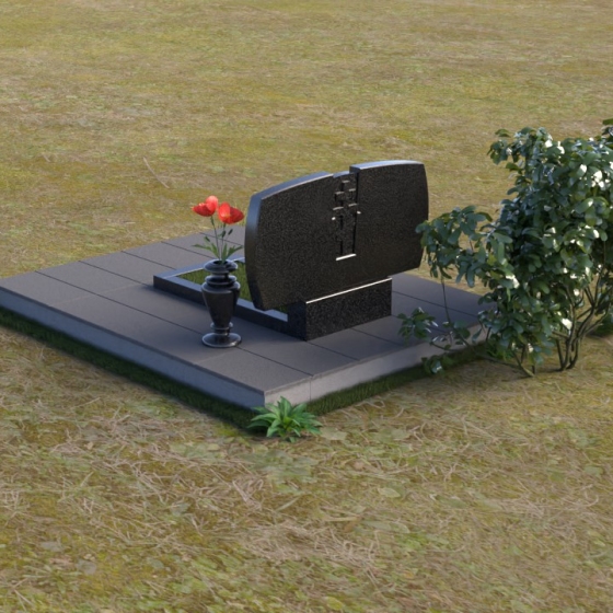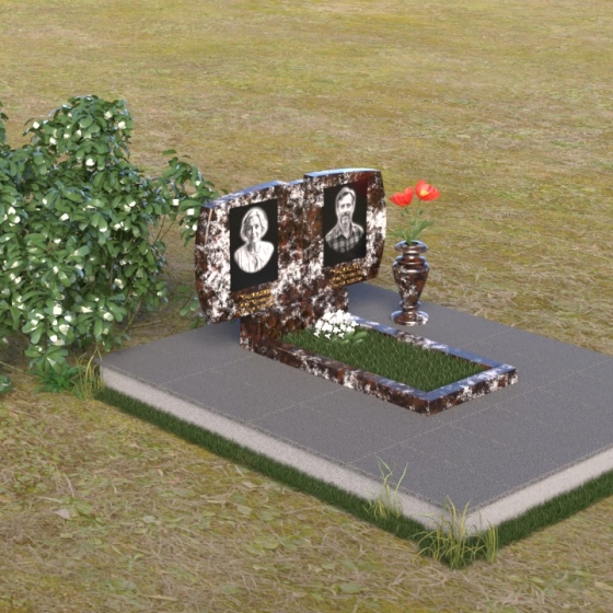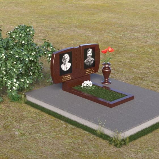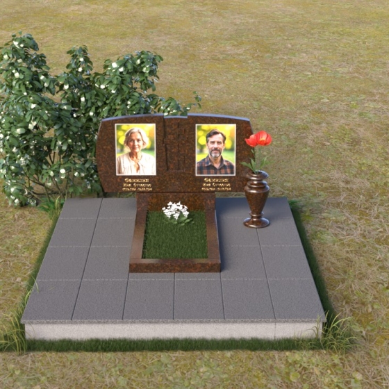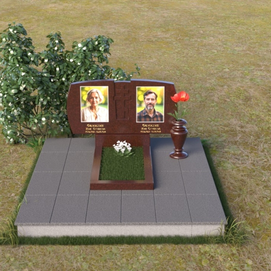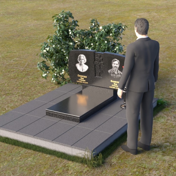 Геометрия модели тщательно продумана. Верхняя часть стел имеет скругленные углы, смягчающие строгость линий и придающие композиции более человечный облик. Между портретами выгравирован лаконичный православный крест, напоминающий о духовности и вере. Основание стел переходит в горизонтальную плиту, образуя единую плоскость с надгробной плитой. Надгробная плита выполнена в виде прямоугольника с полированной поверхностью, отражающей небо и окружающий мир. У основания композиции располагается аккуратная ваза из черного гранита, предназначенная для живых цветов, как символ непреходящей любви и уважения.