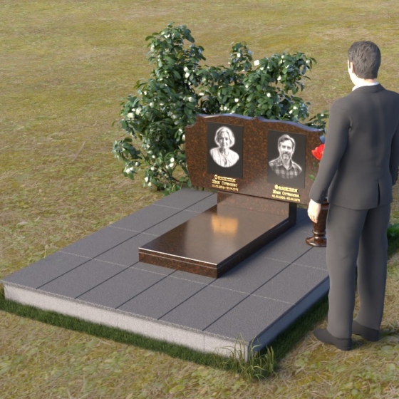 Композиция монумента строится на контрасте плавных линий и строгих геометрических форм. Верхняя часть, несущая на себе портреты усопших, имеет форму, напоминающую раскрытую книгу или свиток, где каждая страница хранит историю жизни. Края этого "свитка" искусно обработаны: верхняя грань словно оплавлена временем, приобретая мягкие, неровные очертания, а боковые стороны имеют более четкий, но все же сглаженный профиль. Фаска, идущая по периметру, придает верхней части визуальную легкость, отделяя ее от основания. Нижняя часть представляет собой прямоугольную плиту с зеркальной полировкой, отражающей небо и окружающий мир, создавая эффект бесконечности и связи с ушедшим. Она словно портал, соединяющий мир живых и мир мертвых, напоминая о непрерывности бытия. Боковины плиты имеют четкую геометрию, подчеркивая основательность и незыблемость памяти.