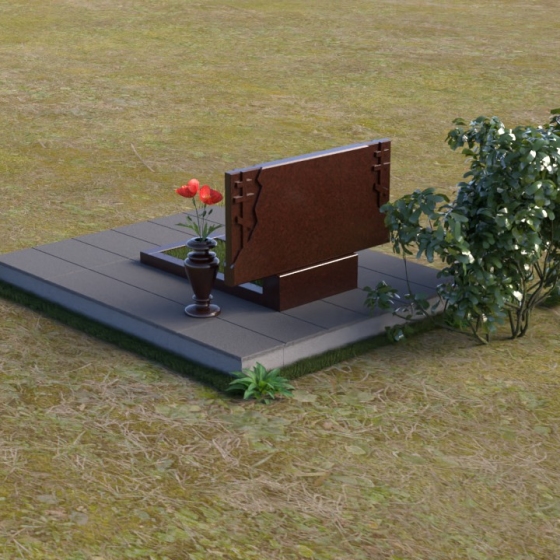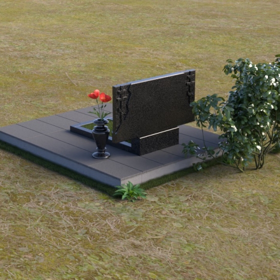 Мемориальная композиция ПГ140 представляет собой лаконичное и в то же время выразительное решение. Основной элемент – вертикальная стела из полированного гранита, увенчанная резным крестом в верхней левой части. Крест выполнен в строгой, геометрической форме, символизирующей веру и духовность. Его грани четко очерчены, а полированная поверхность переливается на солнце, создавая ощущение света и надежды. Боковые грани стелы имеют неровную, словно сколотую фактуру, что придает композиции особую выразительность и естественность. Контраст между зеркальной полировкой основной поверхности и матовой текстурой боковин акцентирует внимание на деталях и создает игру света и тени. Нижняя часть стелы переходит в горизонтальную плиту, также выполненную в черном полированном граните. Ее зеркальная поверхность отражает небо и окружающий пейзаж, создавая эффект глубины и бесконечности. Рядом со стелой расположена элегантная ваза из черного гранита, предназначенная для живых или искусственных цветов. Ее классическая форма и полированная поверхность гармонично дополняют общую композицию.