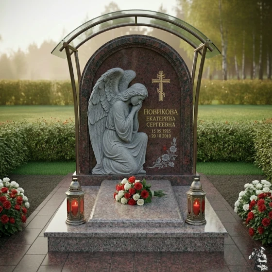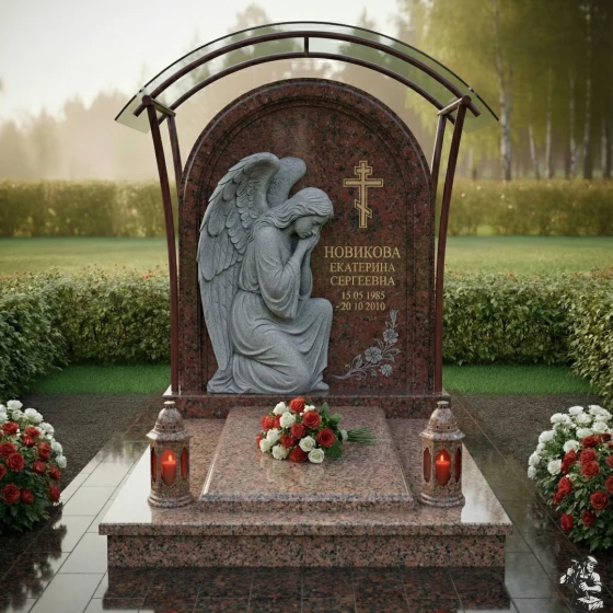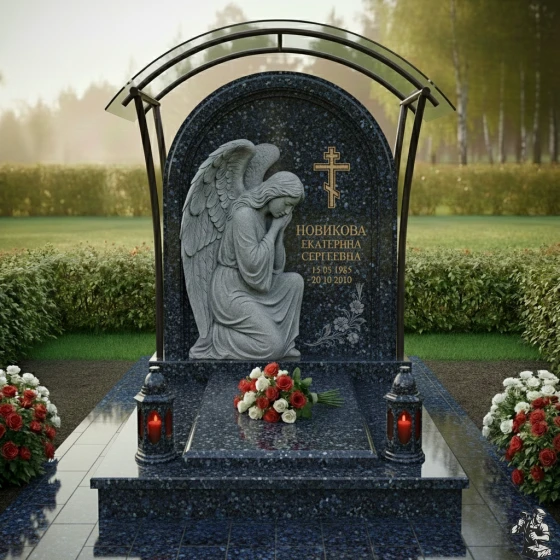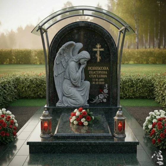 Центральный элемент композиции – стела, выполненная в форме элегантной арки с плавно закругленной вершиной, что придает ей особую мягкость и утонченность. Ее грани обработаны с безупречной точностью, создавая эффект легкого, едва уловимого перехода от полированной поверхности к матовым срезам, подчеркивающим естественную красоту камня. На левой стороне стелы расположена объемная, искусно вырезанная фигура скорбящего ангела. Его крылья, тщательно проработанные до мельчайших перьев, кажется, готовы вот-вот взмыть ввысь, а склоненная голова и сложенные в молитве руки передают глубокое чувство утраты и безмолвной печали. Скульптура выполнена в светлом, контрастном по отношению к основной поверхности камня, оттенке, что создает эффект света и тени, придавая изображению живость и драматизм. На правой стороне стелы выгравирован лаконичный православный крест, возвышающийся над именем и датами жизни усопшего, выполненными в строгом, но изящном шрифте. В нижней части стелы, под датами, расположена тонкая гравировка изящной цветочной ветви, символизирующей нежность и хрупкость жизни. Поверхность стелы имеет глубокую, зеркальную полировку, отражающую свет и создающую ощущение глубины и торжественности.