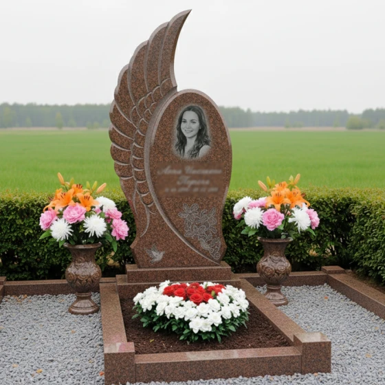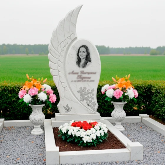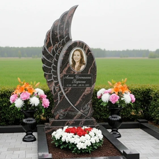 Центральным элементом комплекса является стела, выполненная в уникальной асимметричной форме, напоминающей распахнутое крыло ангела или взлетающую птицу, символизирующую вознесение души и безмятежный покой. Одна сторона стелы имеет строгую вертикальную линию, тогда как другая плавно изгибается вверх, создавая ощущение легкости и устремленности. Эта динамичная форма, лишенная острых углов, передает идею непрерывности жизненного пути и перехода в иное измерение. Грани стелы тщательно отполированы, что придает камню зеркальный блеск и глубину, в то время как внутренняя часть "крыла" украшена объемной резьбой, имитирующей перья. Эта резьба создает игру света и тени, подчеркивая естественную фактуру камня и придавая композиции дополнительный объем и выразительность. На лицевой стороне стелы, в верхней части, выгравирован овальный портрет, обрамленный тонкими линиями, а ниже — информация о покойном, выполненная изящным шрифтом. В нижней части стелы расположена гравировка двух летящих голубей — вечного символа мира, чистоты души и небесного покоя, что еще больше усиливает эмоциональное воздействие мемориала.