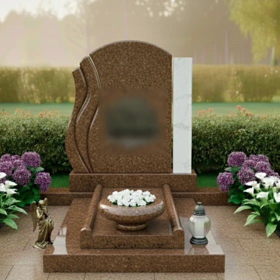 Подножие стелы представляет собой многоуровневую конструкцию, добавляющую композиции объем и значимость. Массивная основа, на которую установлена стела, плавно переходит в широкую надгробную плиту, полностью покрывающую место захоронения. Это решение не только создает законченный и эстетически выверенный вид, но и значительно упрощает уход за местом упокоения. На надгробной плите, по центру, располагается глубокая, чашеобразная ваза для цветов, выполненная в едином стиле с основным комплексом. Ее плавные линии и темный оттенок идеально гармонируют с общим дизайном, предлагая место для живых цветов, как символа непрекращающейся памяти и связи.
