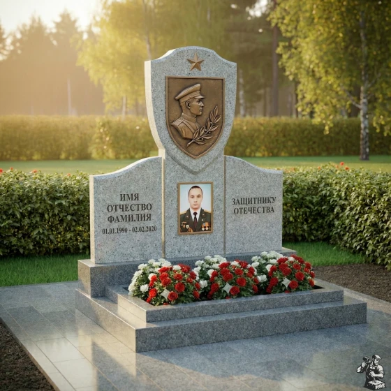 Центральное место в композиции занимает верхняя часть стелы, выполненная в форме геральдического щита, увенчанного пятиконечной звездой — символом воинской доблести и славы. На щите расположен объемный бронзовый барельеф, изображающий профиль мужчины в военной форме, окруженный лавровой ветвью — традиционным знаком победы и мира. Этот элемент придает монументу особую торжественность и подчеркивает героический характер личности. Под щитом, на основной части стелы, расположена глубокая ниша, предназначенная для портрета, который словно вписан в камень, становясь его неотъемлемой частью. Текст «ИМЯ ОТЧЕСТВО ФАМИЛИЯ» и даты жизни выполнены четким, строгим шрифтом, а справа расположена надпись «ЗАЩИТНИКУ ОТЕЧЕСТВА», выгравированная с особым почтением. Контраст между идеально отполированной черной поверхностью камня и матовыми, глубоко выгравированными элементами создает динамичное визуальное восприятие, подчеркивая значимость каждой детали.
