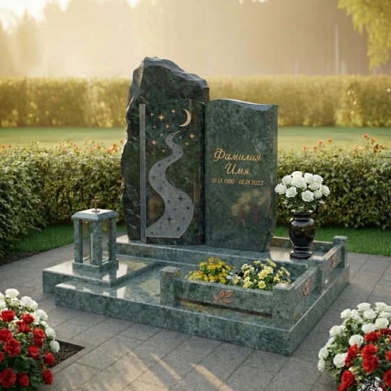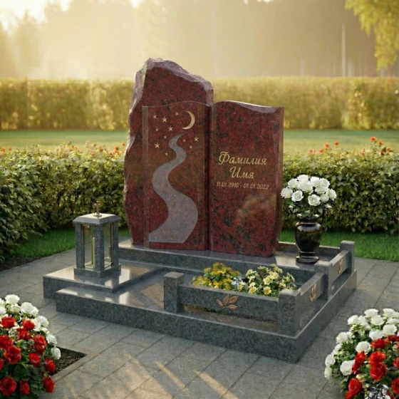 • Полировка: Зеркальная полировка на правой стеле и элементах благоустройства, а также контрастная, необработанная фактура левой стелы, создают удивительную игру света и тени, подчеркивая естественную красоту камня и его глубокий цвет. Гравировка на левой стеле, выполненная в технике контрастной фактуры, придает изображению объем и выразительность.