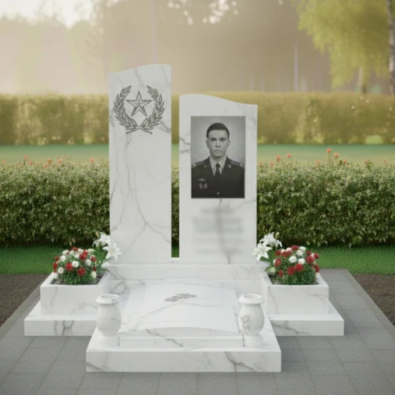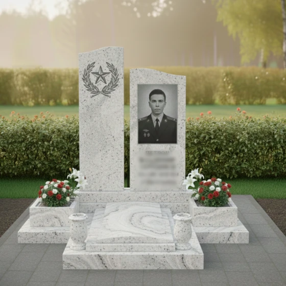 Оформление: Для данной мемориальной композиции с ее строгими линиями и гладкими поверхностями идеально подойдет гравировка портрета на правой стеле. Высокое качество полировки камня позволяет добиться максимальной детализации и реалистичности изображения, передавая каждую черту лица и глубину взгляда. ФИО и даты жизни могут быть нанесены как под портретом, так и на левой стеле, в зависимости от предпочтений. Рекомендуется использовать классические, строгие шрифты, которые подчеркнут торжественность и достоинство композиции. Дополнительно можно добавить эпитафию или символические элементы, такие как ветвь лавра, крест или цветок, которые будут гармонировать с общим стилем и выражать глубокие чувства.