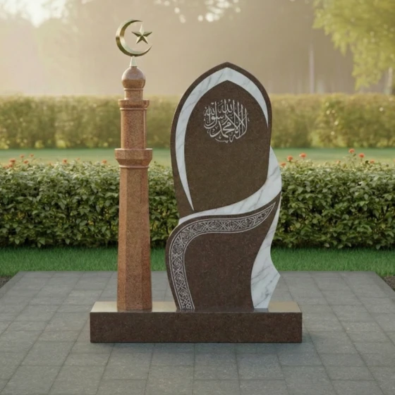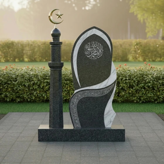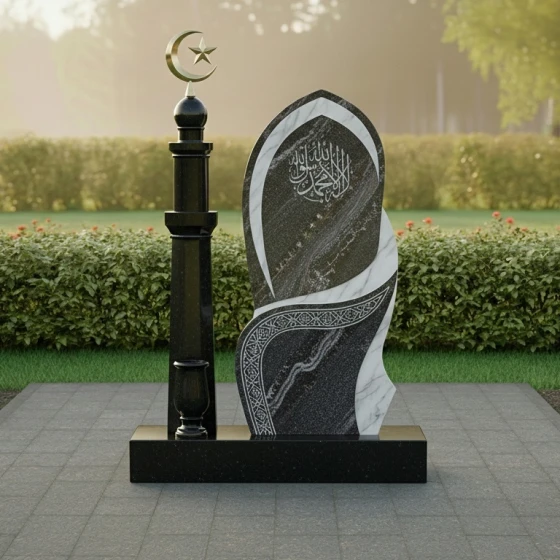 Поверхность стелы представляет собой великолепную игру контрастов. Основная часть выполнена из глубокого черного гранита с зеркальной полировкой, которая отражает свет, создавая ощущение глубины и торжественности. На этом фоне выделяется вставка из светлого мрамора, расположенная в верхней части и плавно переходящая в изящную волну, опоясывающую стелу. Эта вставка, напоминающая очертания исламского полумесяца, символизирует свет и надежду. На матовой поверхности светлого мрамора искусно выгравированы каллиграфические узоры, которые добавляют монументу культурную и духовную ценность. В нижней части стелы, на черном граните, также присутствует тонкий орнамент, выполненный в технике гравировки, который подчеркивает изысканность и детализацию всей работы.