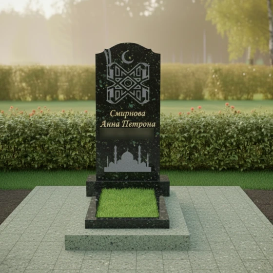 Данная мемориальная композиция под артикулом 722 представляет собой образец высокого художественного мастерства, где каждая линия пропитана уважением к традициям и духовности. Центральная стела выполнена в классической вертикальной форме с изящным навершием, напоминающим очертания купола мечети или арку священных врат. Плавный изгиб верхней грани придает монументу завершенность и гармонию, смягчая строгость натурального камня. Безупречная зеркальная полировка лицевой стороны создает глубокий, почти мистический блеск, на фоне которого особенно эффектно смотрятся элементы художественной резьбы.