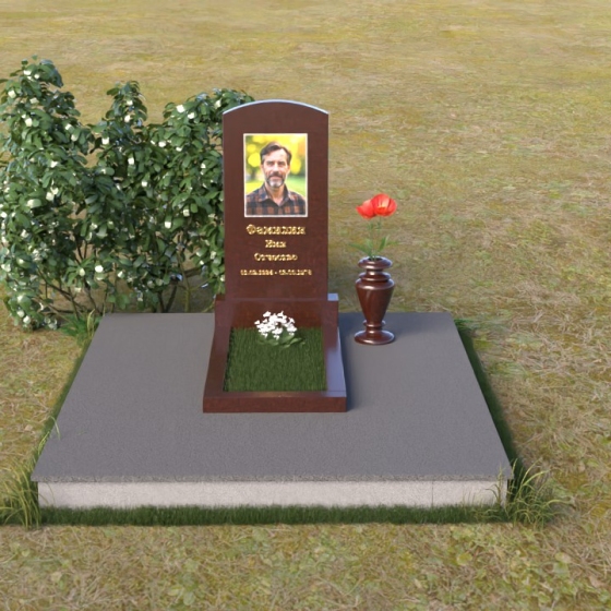 Благодаря своей лаконичной форме, эта стела предоставляет широкие возможности для оформления. Портрет усопшего будет гармонично смотреться как в верхней части стелы, так и чуть ниже центра. Золотое тиснение имени и дат жизни будет элегантно выделяться на фоне полированного камня, создавая четкий и легко читаемый образ. Небольшая тумба, расположенная перед стелой, может служить местом для возложения цветов и памятных вещей. Мы рекомендуем выбирать для этой модели сдержанные, лаконичные шрифты, которые подчеркнут общую элегантность композиции. Подумайте о возможности добавления небольшого бронзового барельефа или скульптуры, отражающей профессию или увлечения ушедшего человека. Это добавит индивидуальности и сделает место памяти еще более личным и значимым. Ваза, выполненная в едином стиле с монументом, завершит композицию и придаст ей законченный вид.