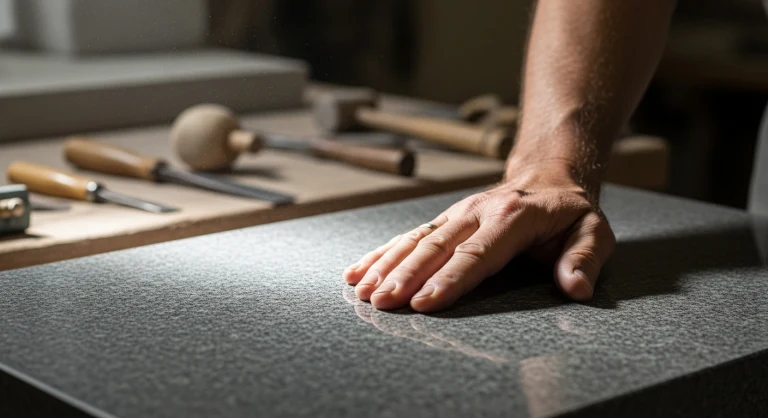 1. Личный контроль: Наш специалист лично проверяет каждую партию камня. Это не формальный осмотр. Он ищет скрытые дефекты: микротрещины, которые могут привести к расколу через несколько зим; неоднородность структуры, которая испортит вид гравировки; ржавые вкрапления железа, которые со временем могут проявиться некрасивыми пятнами. Мы отбираем только те плиты, которые соответствуют нашим внутренним, более строгим, чем ГОСТ, стандартам.
