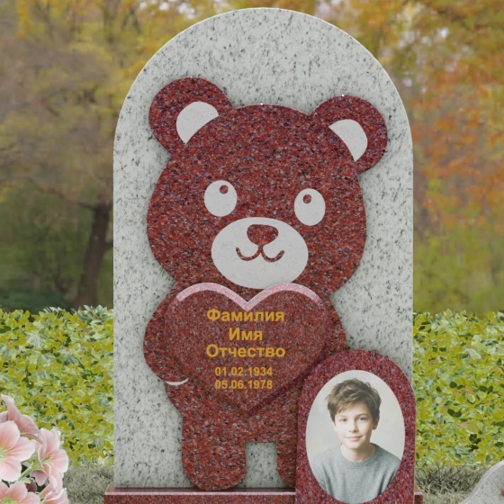 Данная мемориальная композиция представляет собой уникальное сочетание трогательной нежности и величественной непоколебимости камня. В центре художественного замысла лежит глубокий символизм: фигура медвежонка, бережно держащего в лапах сердце, олицетворяет чистоту, бесконечную родительскую любовь и защиту, которую близкие стремятся подарить даже после ухода дорогого человека. Это надгробие из натурального камня выполнено в технике художественного комбинирования различных пород, что создает потрясающий визуальный объем. Массивная светлая стела с полукруглым завершением служит идеальным фоном для темного силуэта, вырезанного с ювелирной точностью. Игра контрастов между зеркальной полировкой черного камня и благородной текстурой светлого гранита подчеркивает каждую деталь: от доброго взгляда лесного покровителя до мягких контуров его фигуры.