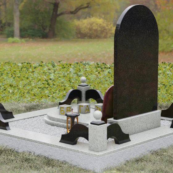 Художественное решение памятника продумано до мелочей, включая элементы благоустройства, которые создают единый архитектурный ансамбль. Стела установлена на массивный постамент, который обеспечивает устойчивость всей конструкции. Композицию дополняет изящный цоколь с декоративными столбиками, увенчанными каменными шарами. Эти элементы не только очерчивают границы участка, но и придают ему торжественный, законченный вид. В нижней части композиции предусмотрена отдельная вставка — овальный медальон из красного камня, идеально подходящий для размещения фотокерамики или гравированного портрета. Такое расположение позволяет гармонично разделить текстовую информацию и визуальный образ, не перегружая основную художественную часть.