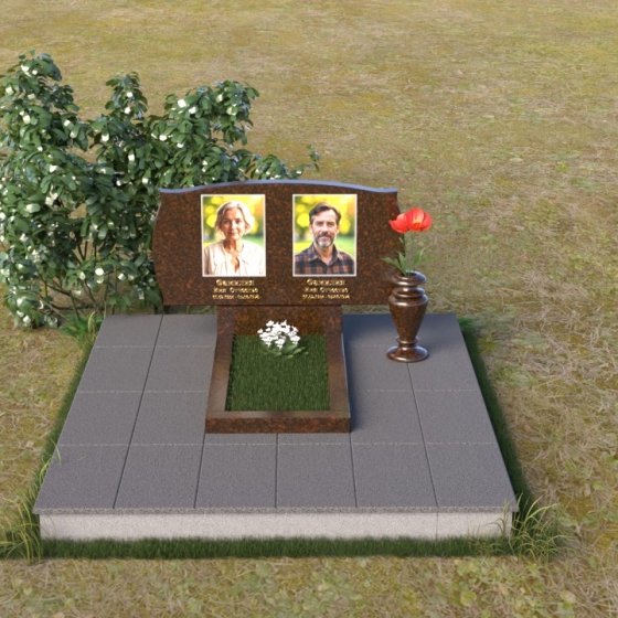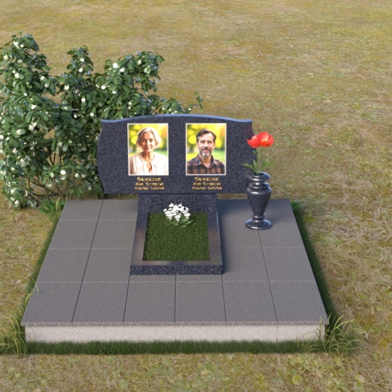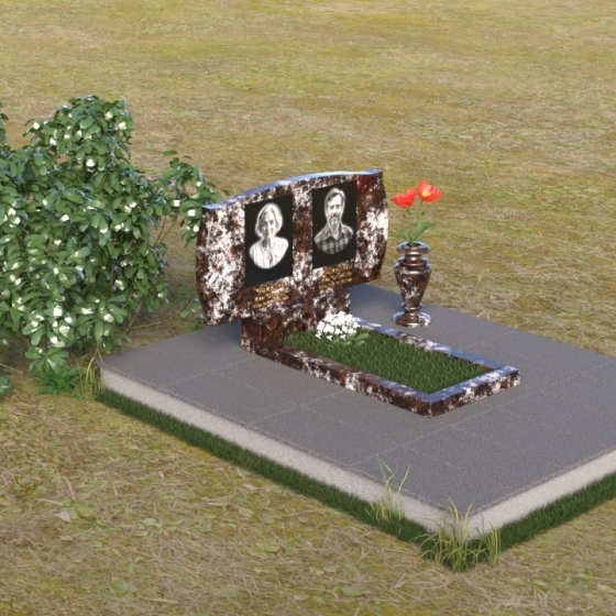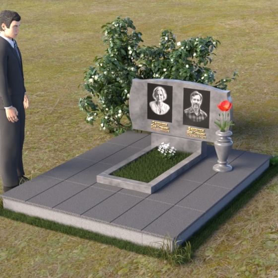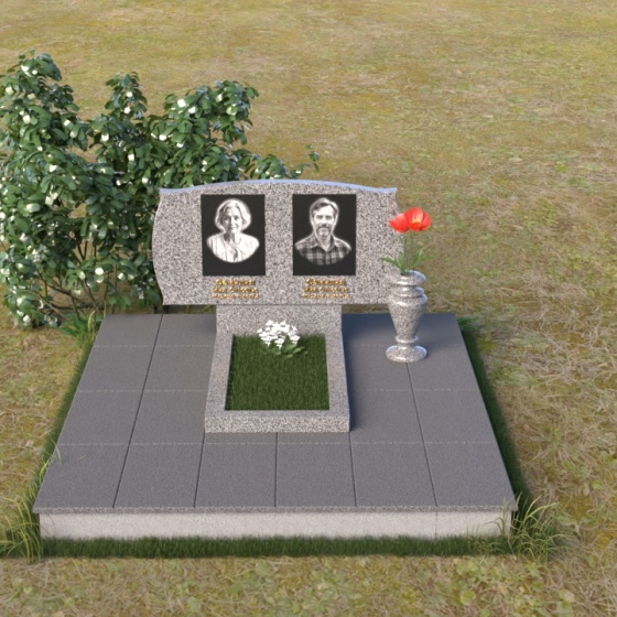 Величественная стела ПГ124 представляет собой гармоничное сочетание строгих линий и плавных изгибов. Верхняя часть памятника имеет волнообразную форму, словно повторяя контуры облаков или мягкие складки ткани. Два плавных выступа образуют своеобразные "плечи", обрамляющие портреты усопших. Края стелы деликатно скруглены, смягчая строгость камня и придавая ему благородный вид. Нижняя часть стелы переходит в прямоугольную опору, формируя устойчивое основание. Фаски по периметру добавляют визуальную легкость, подчеркивая геометрию формы. Небольшая горизонтальная плита с зеркальной полировкой, расположенная перед стелой, словно отражает небеса, создавая ощущение связи с вечностью.