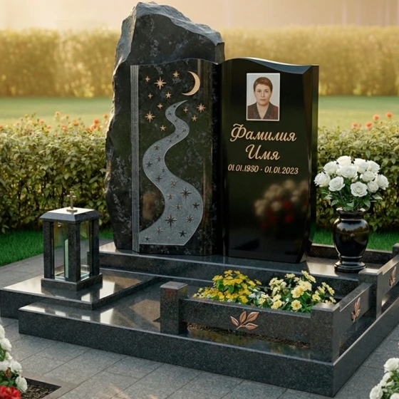 Модель ПН 196 представляет собой двухчастную композицию, где каждая стела обладает своим неповторимым характером. Левая стела, выполненная в виде необработанной скалы, символизирует вечность и незыблемость. Её фактурная поверхность, лишенная зеркальной полировки, создает ощущение первозданной мощи природы. На этой стеле, словно высеченная самой природой, изображена гравировка, стилизованная под ночное небо с извивающейся рекой звезд. Полумесяц и россыпь мерцающих звезд, выполненные с удивительной детализацией, создают эффект глубины и космического спокойствия, а светлая матовая фактура рисунка контрастирует с темным, почти черным полированным фоном, придавая изображению объем и выразительность. Звездная река, плавно уходящая вверх, символизирует путь души к небесам, а звезды напоминают о ярких моментах жизни.